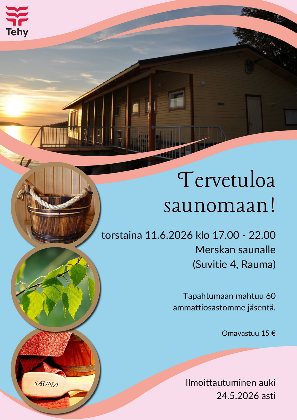 Kunta-alalla työskenteleville jäsenille järjestetään saunailta Raumalla Satamarinessa 7.5. klo 18. Saunomisen lisäksi kuulet ajankohtaiset asiat kera kahvin ja pienen suolaisen.