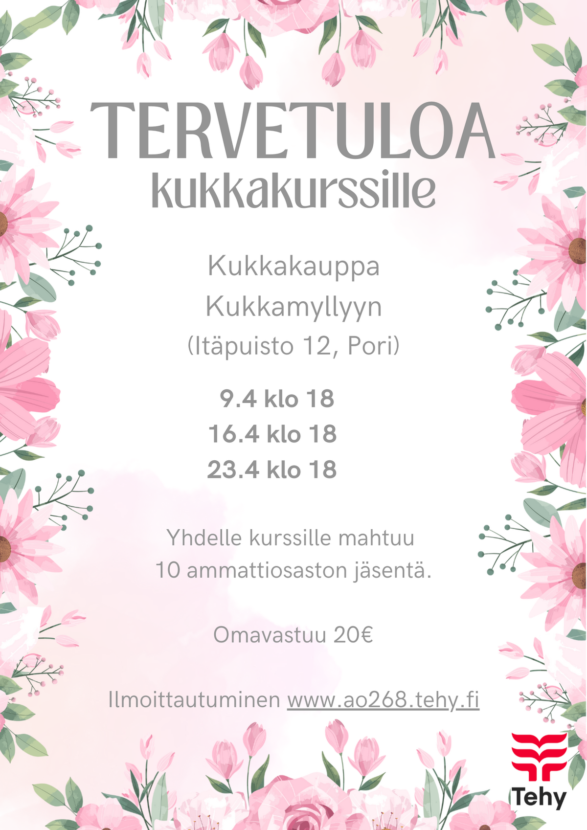 16.4. kurssin omavastuu tulee maksaa viimeistään 23.3.2026 ammattiosaston tilille FI16 5700 8120 1958 00. Huomio! Laita maksaessasi viestikenttään KUKKAKURSSI PORI 16.4.